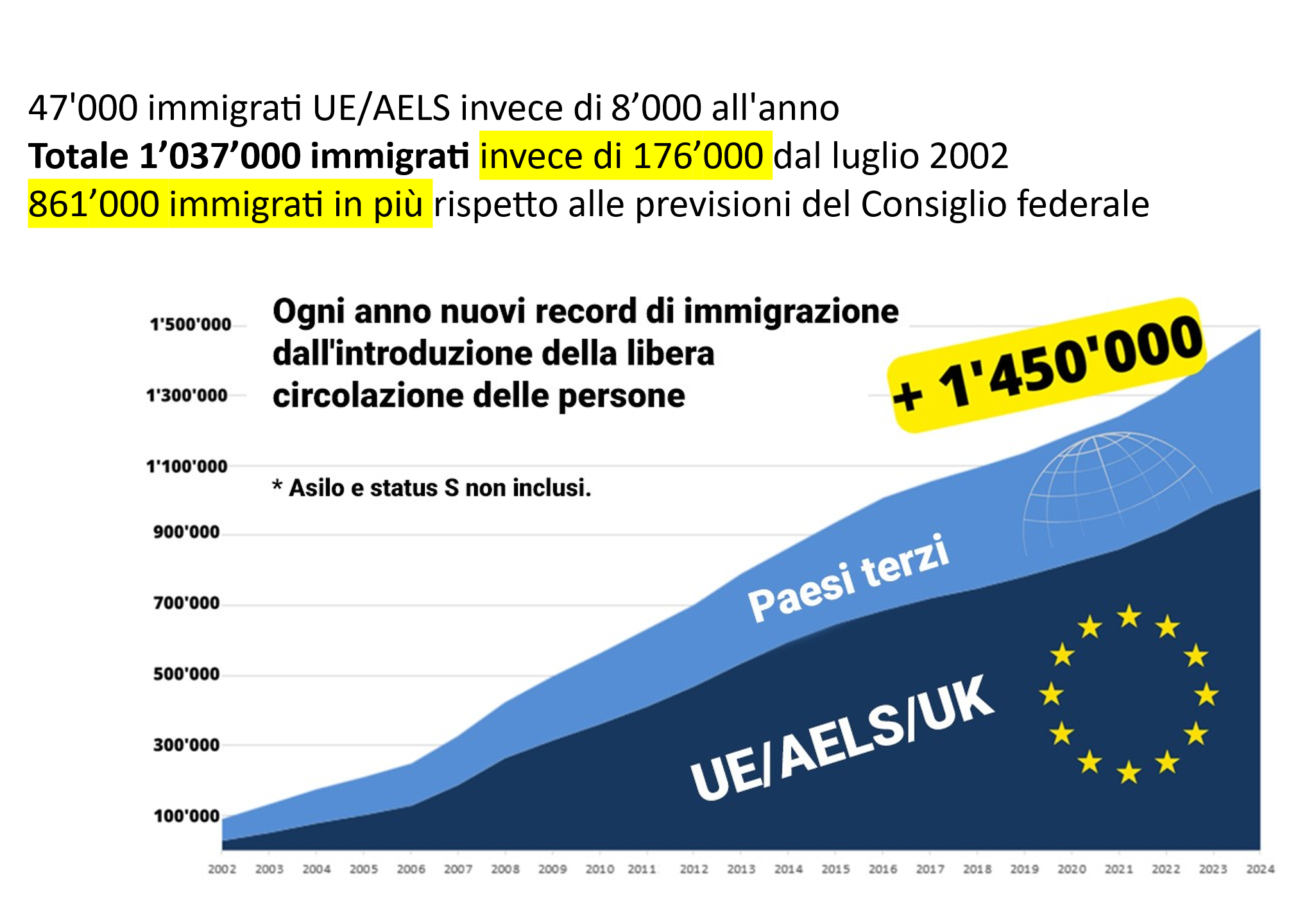 Prima della votazione sulla libera circolazione delle persone con l’UE, il Consiglio federale aveva promesso che ogni anno sarebbero arrivate in Svizzera circa 8’000 persone in più. Si è trattato di un grave inganno nei confronti dell’elettorato: nel 2023 saranno 67’973 le persone provenienti dall’UE/AELS che saranno immigrate in Svizzera!