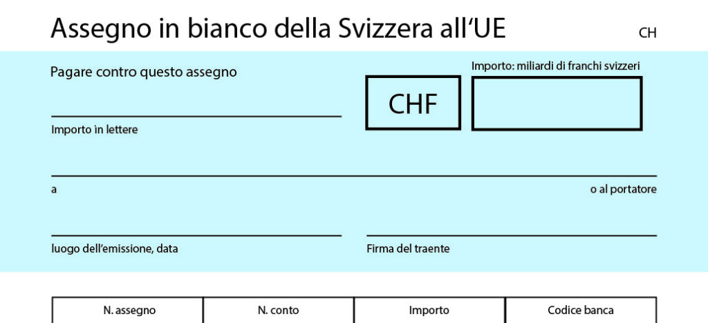Finora la Svizzera ha versato volontariamente all’UE un «contributo di coesione» di 130 milioni all’anno. Ora si tratta di un contributo obbligatorio «giuridicamente vincolante» (350 milioni all’anno). A partire dal 2037, l’UE potrà stabilire autonomamente l’importo di tale contributo: la Svizzera concede all’UE, fortemente indebitata, un assegno in bianco e i contribuenti svizzeri devono pagare.